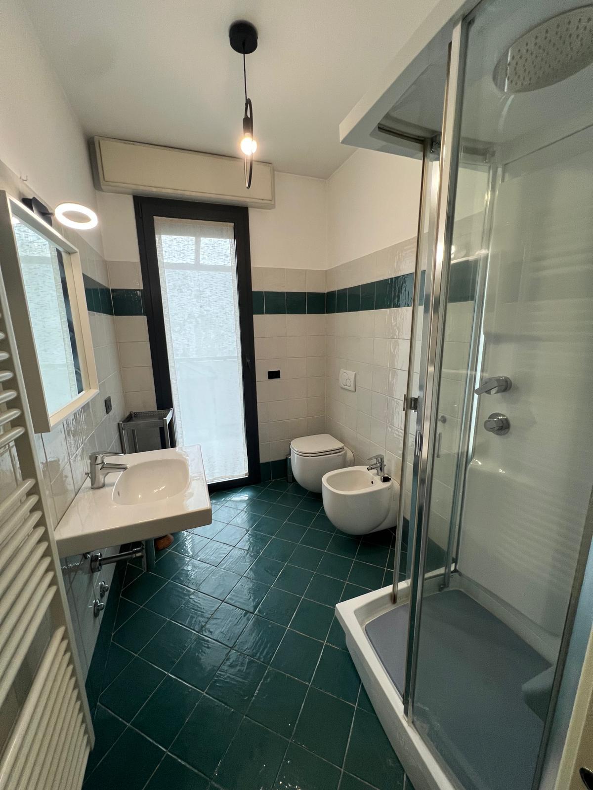 Bagno moderno dotato di doccia idromassaggio, anch’esso collegato alla balconata che unisce i due ambienti.