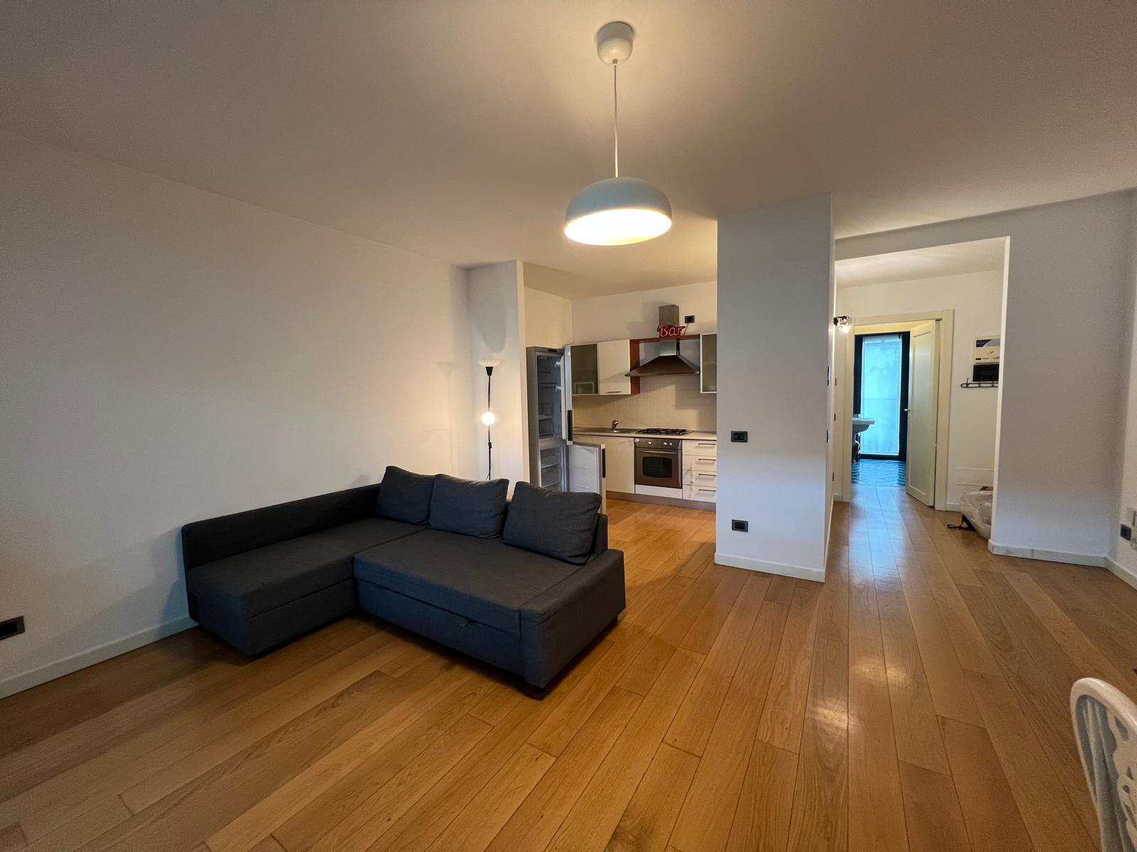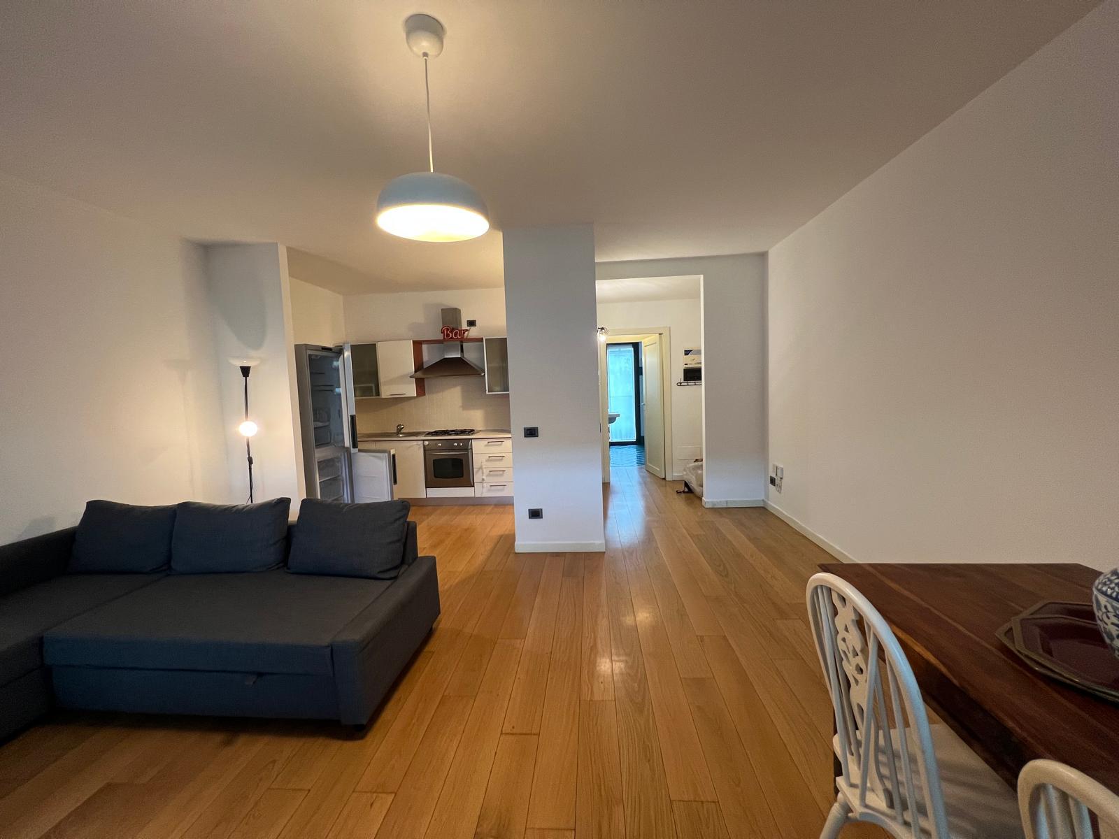 Ingresso su ampio soggiorno con cucina a vista, luminoso e perfettamente organizzato per la vita quotidiana;