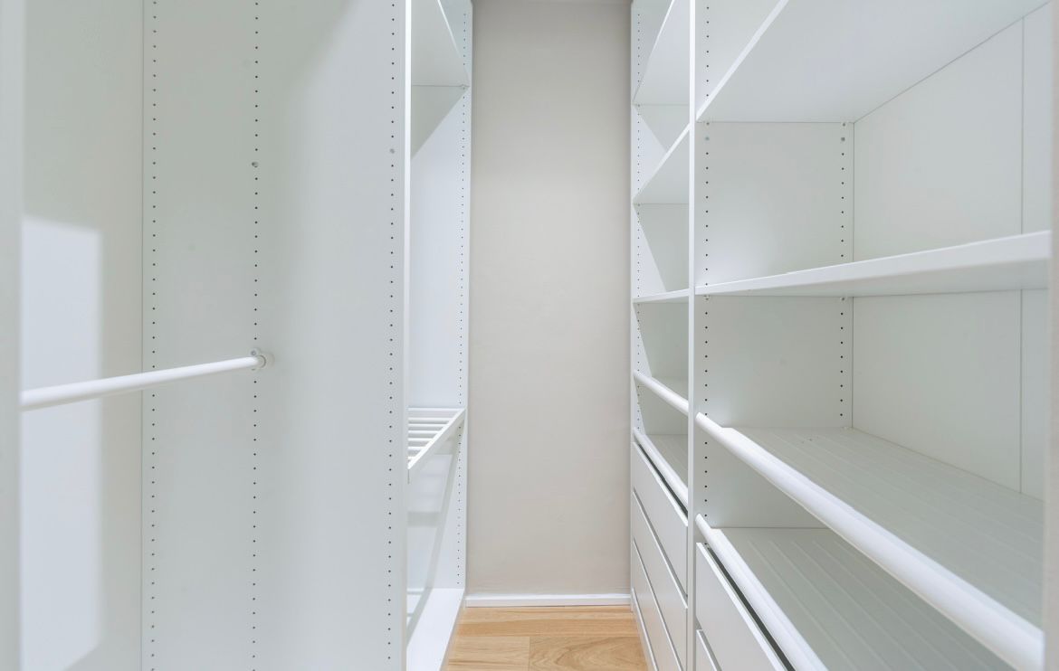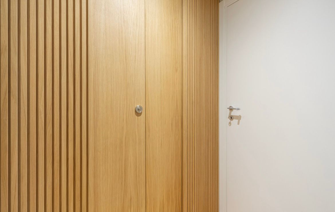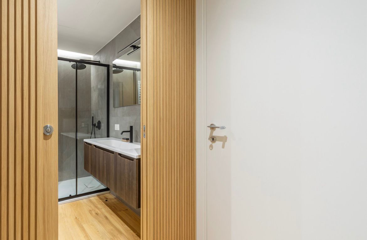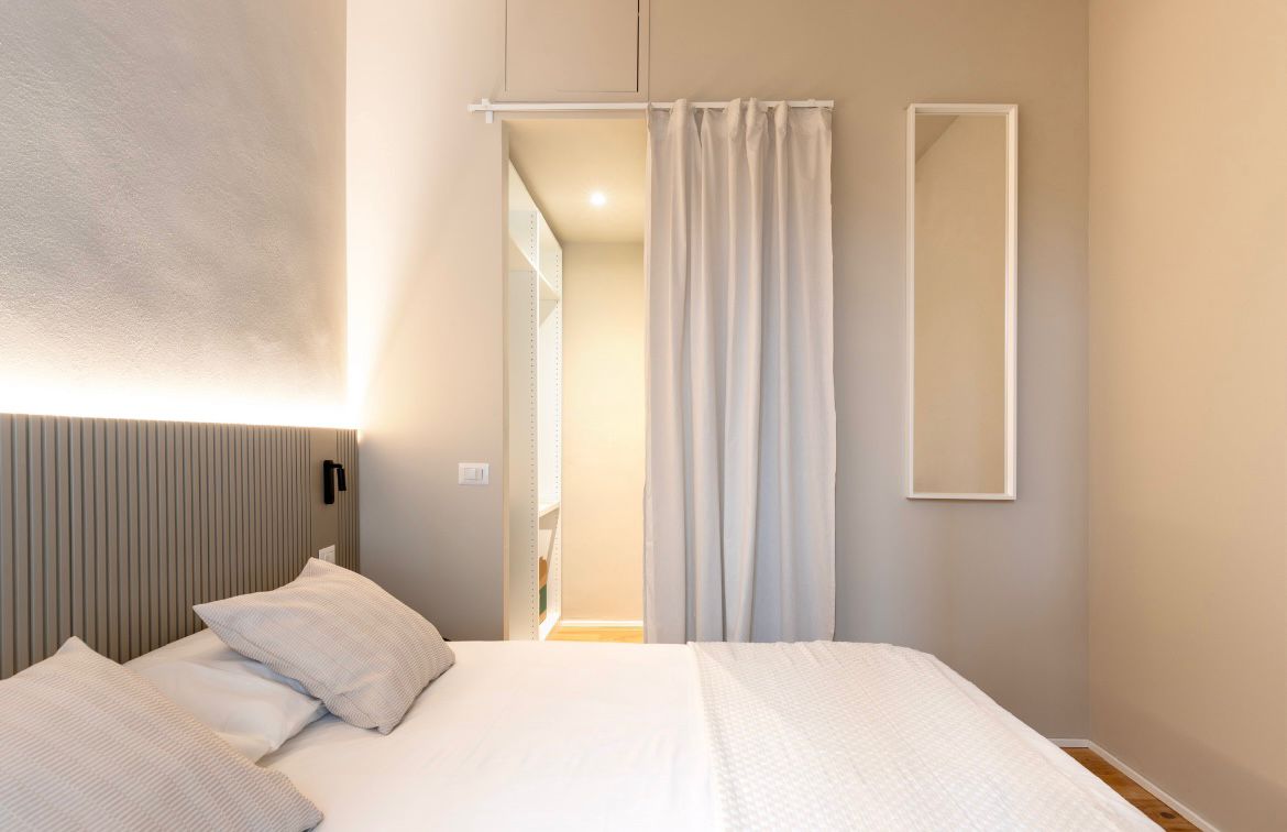 Un moderno disimpegno conduce alla zona notte, composta da una spaziosa camera matrimoniale con cabina armadio e un bagno contemporaneo dotato di box doccia.