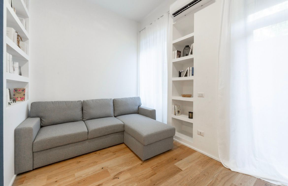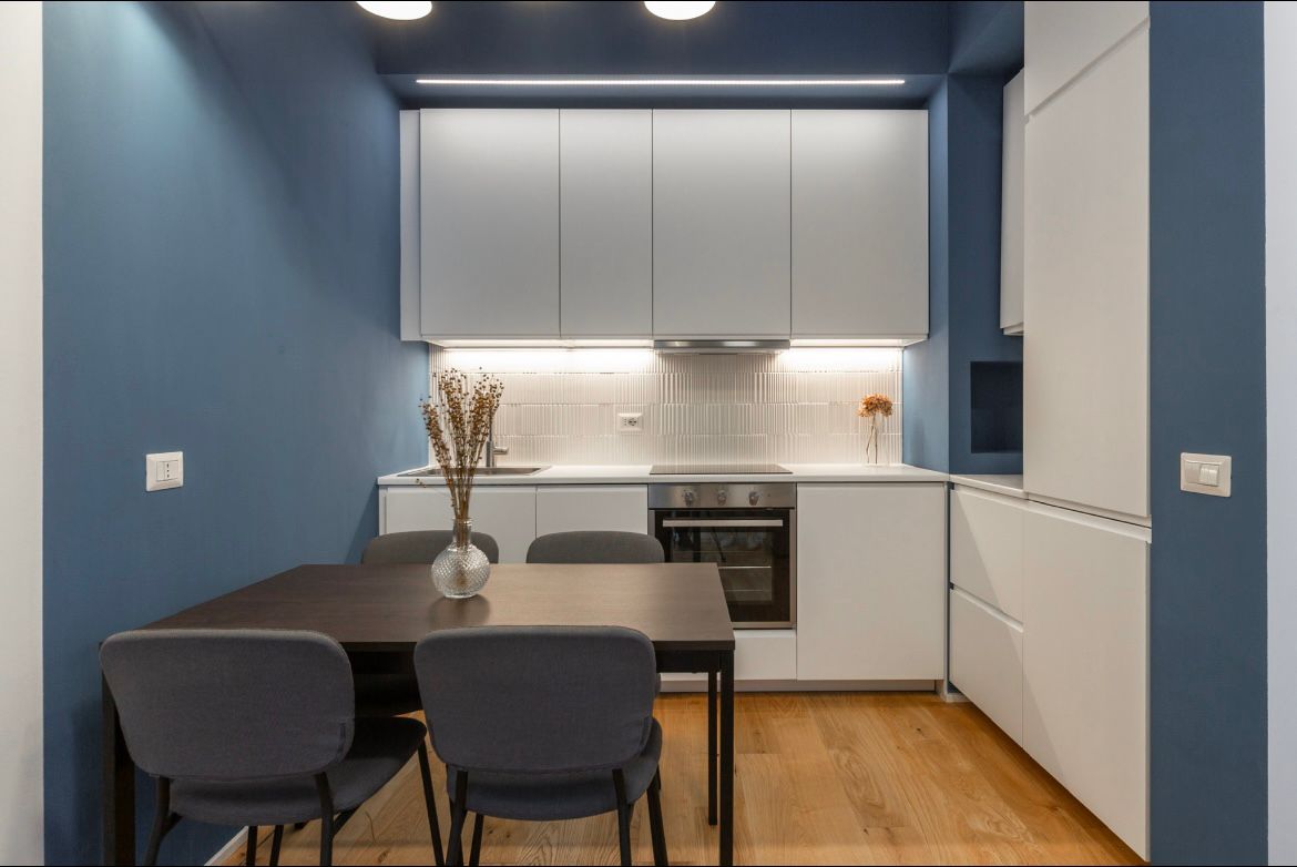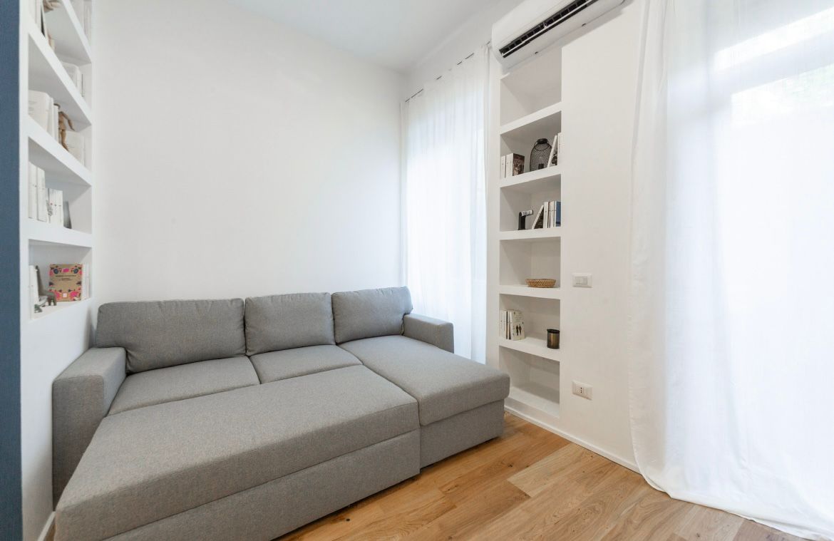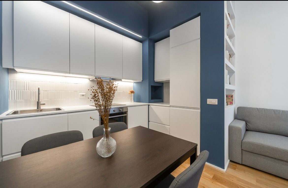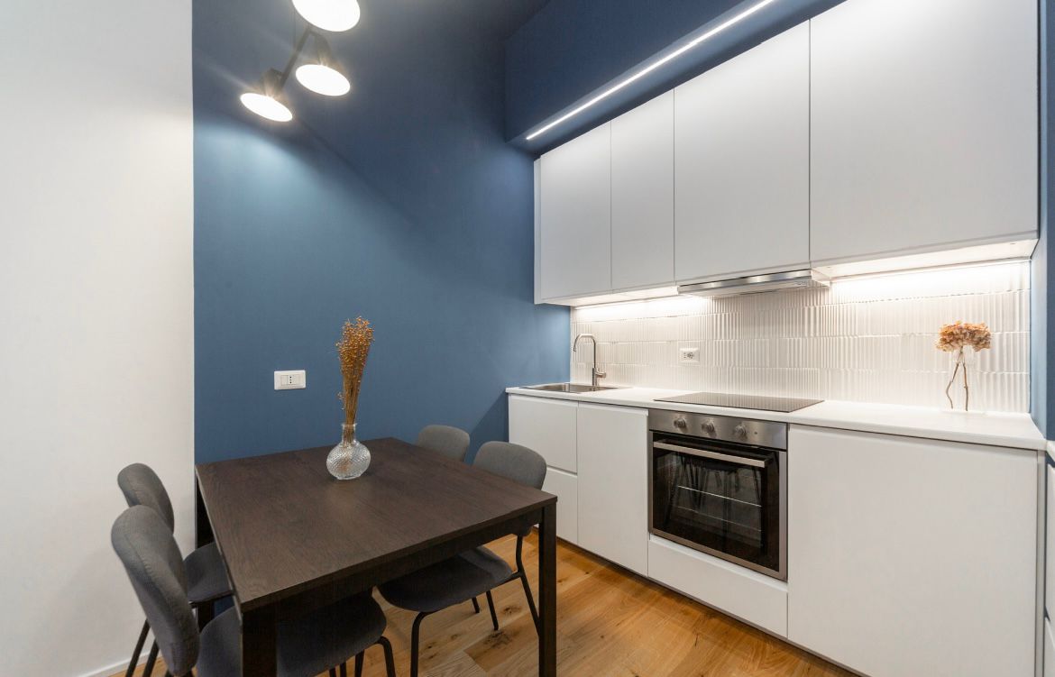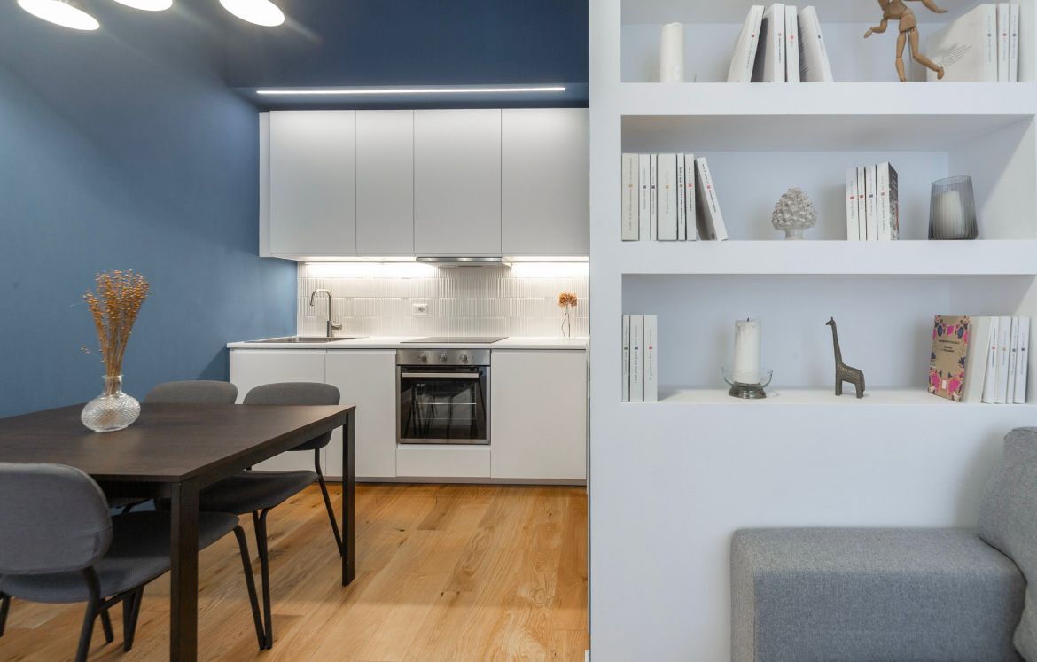L’appartamento, situato al piano terra di un contesto tranquillo con servizio di portineria, si compone di ingresso su luminoso soggiorno con cucina a vista, sapientemente separata dall’area living tramite un raffinato gioco di colori bianco/blu. La cucina è completa di tutti i comfort, tra cui lavastoviglie, piano cottura a induzione e macchina del caffè, mentre il salotto è dotato di divanoletto e smart tv.
