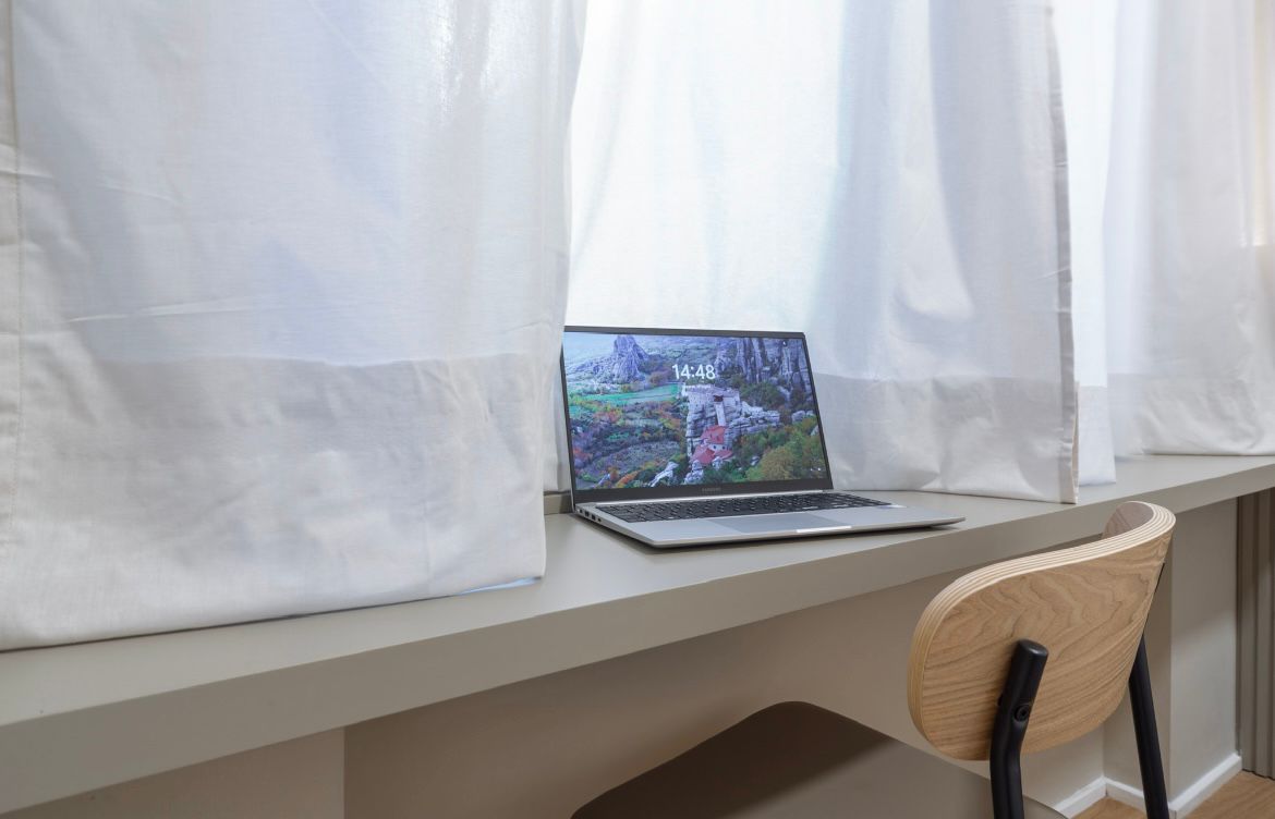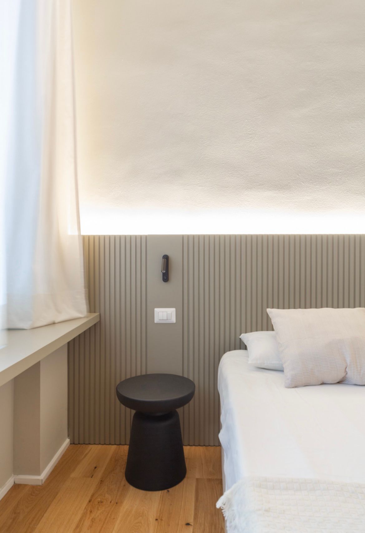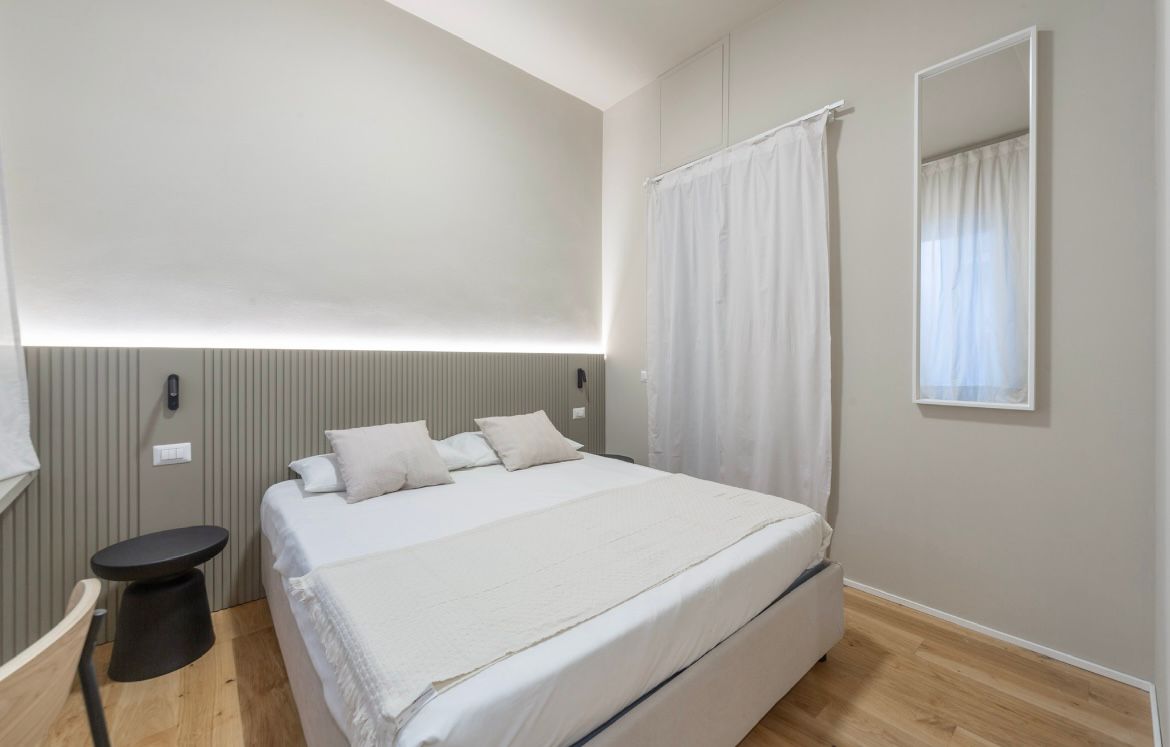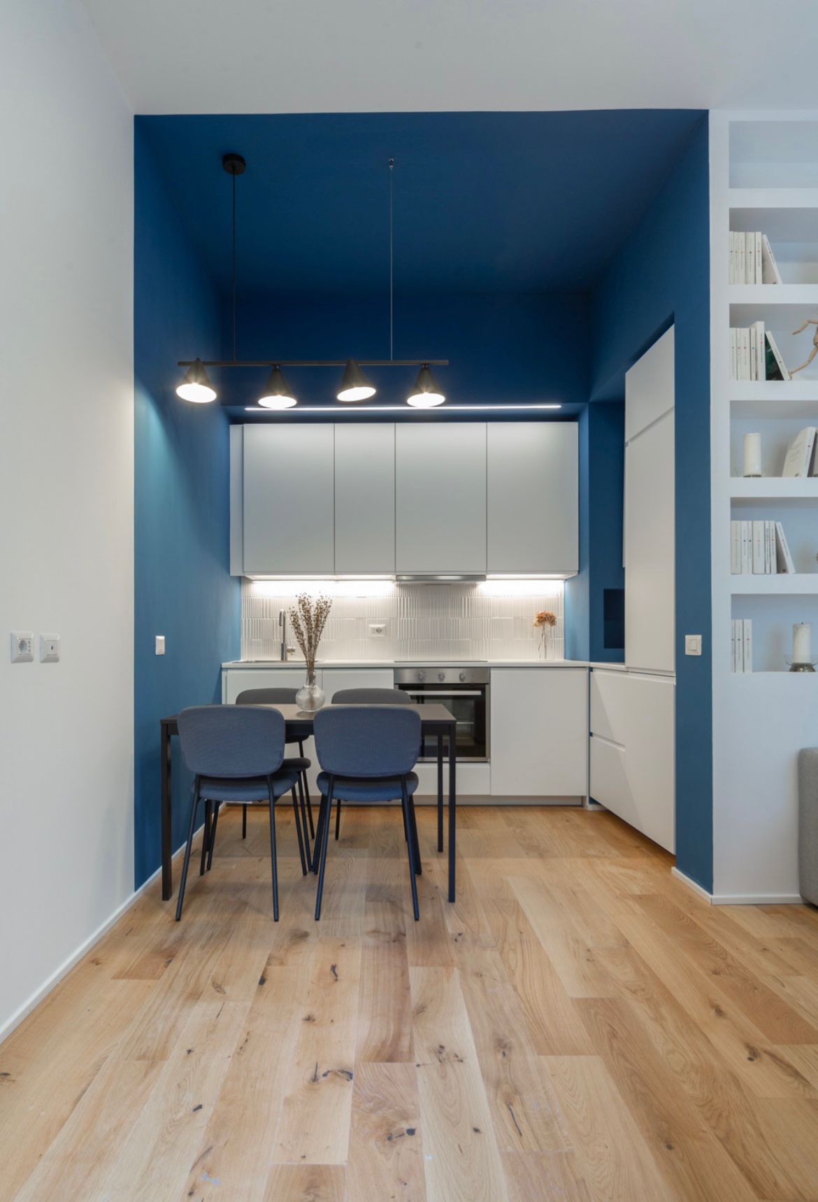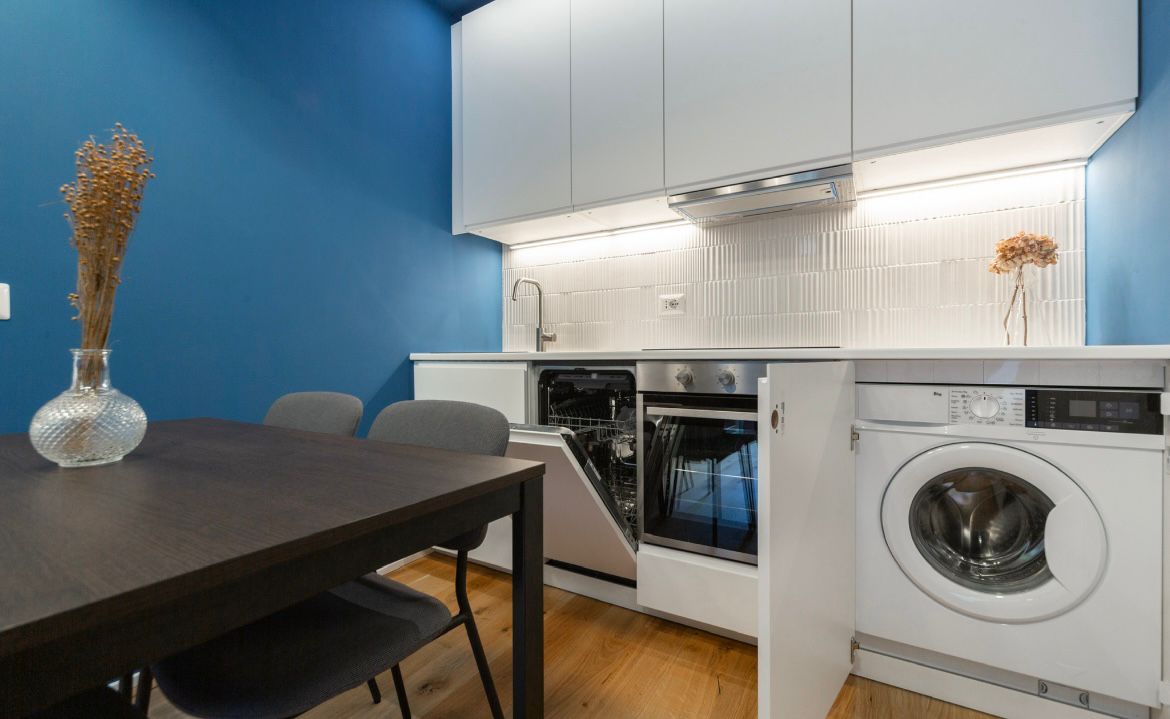 L’appartamento, situato al piano terra di un contesto tranquillo con servizio di portineria, si compone di ingresso su luminoso soggiorno con cucina a vista, sapientemente separata dall’area living tramite un raffinato gioco di colori bianco/blu. La cucina è completa di tutti i comfort, tra cui lavastoviglie, piano cottura a induzione e macchina del caffè, mentre il salotto è dotato di divanoletto e smart tv.