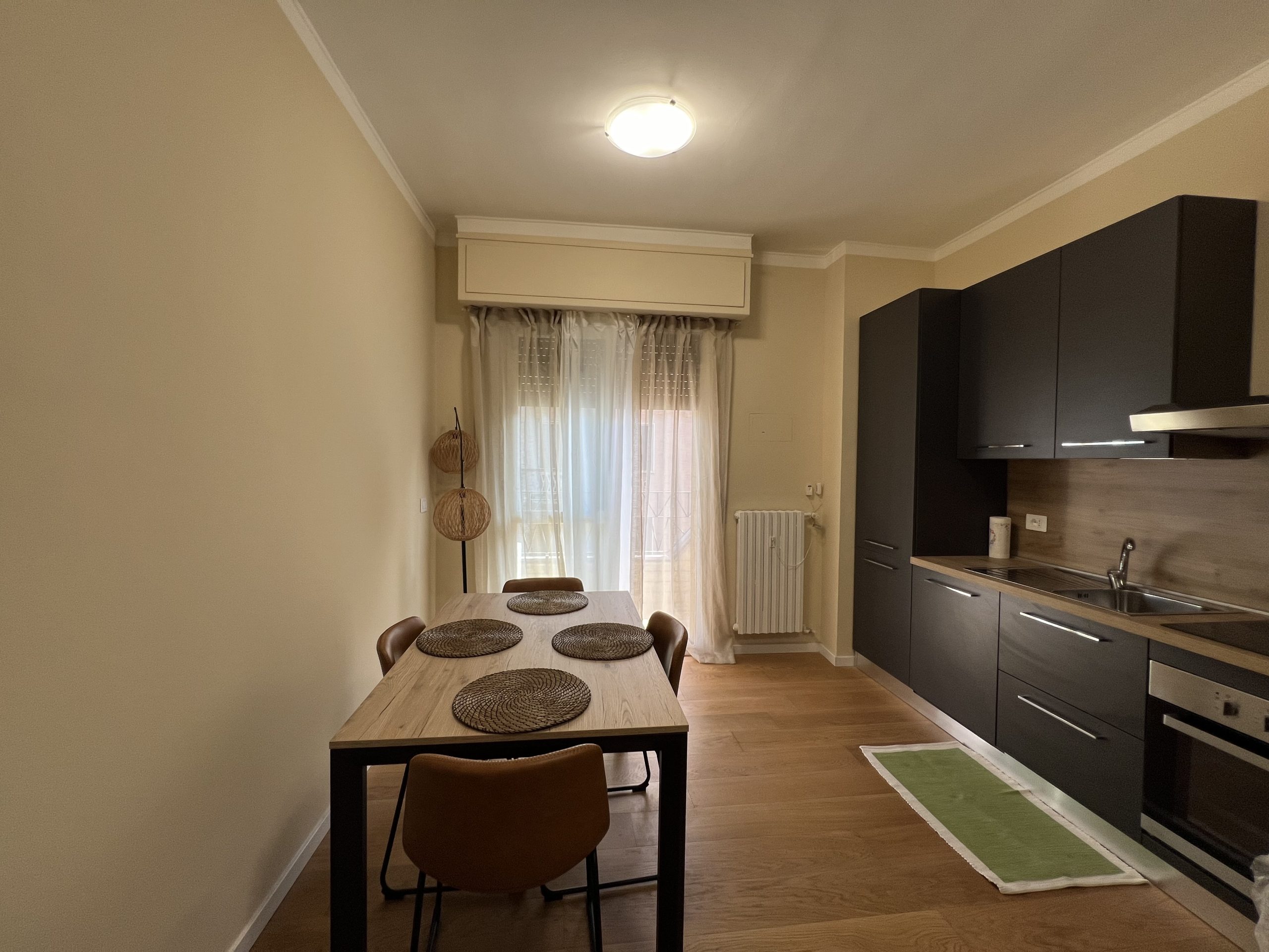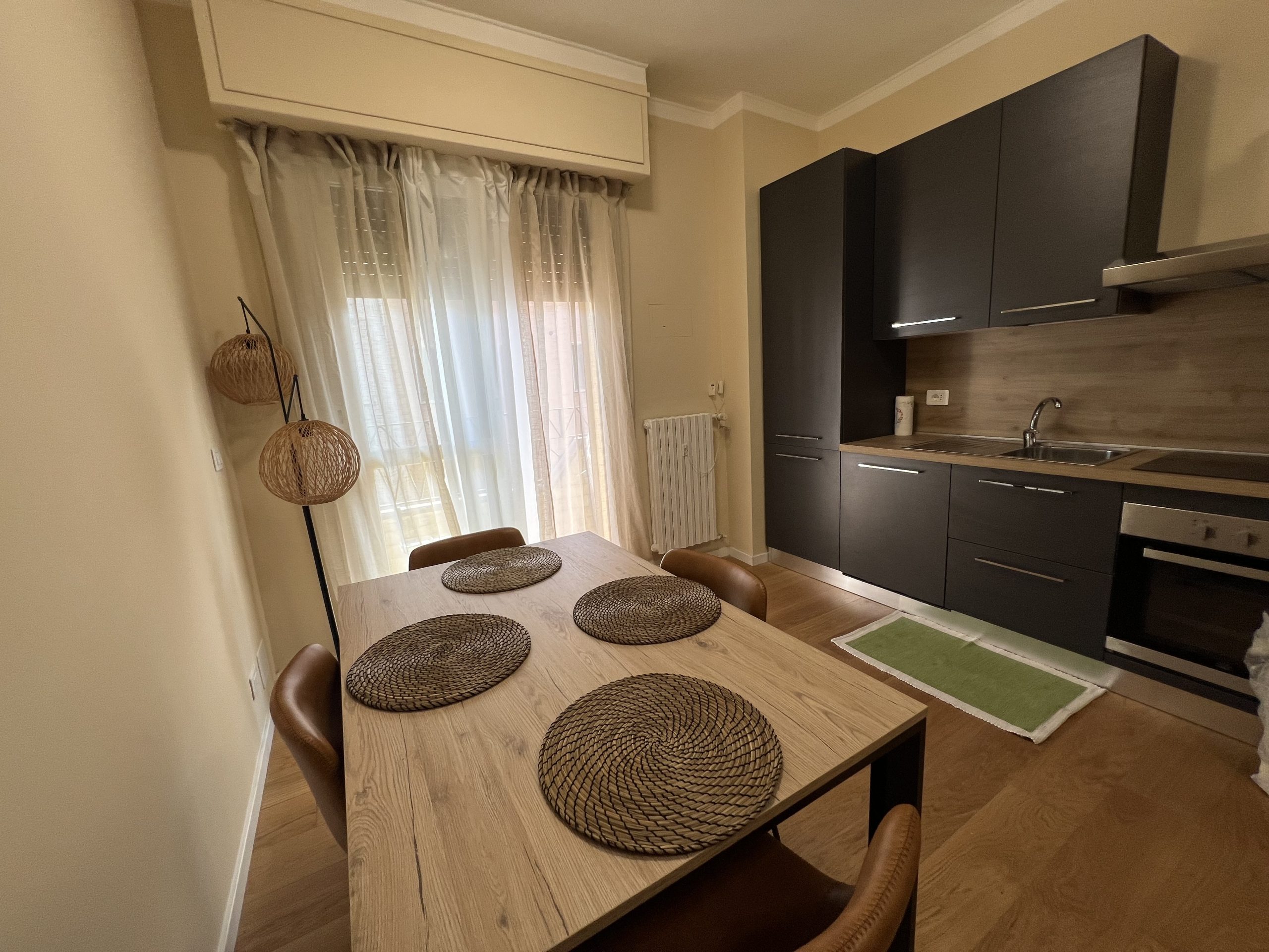 • ingresso su ampia zona living con cucina a vista e balcone; zona completa di divano-letto, tv smart, lavastoviglie, piano cottura a induzione (no gas in casa), forno elettrico, aria condizionata;